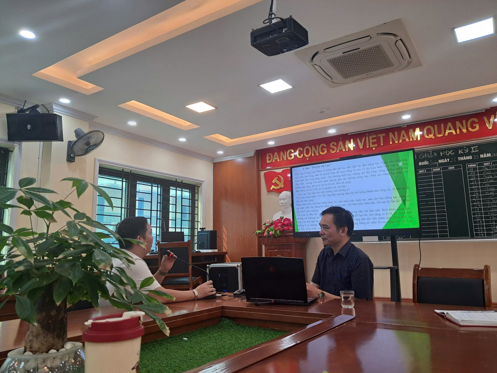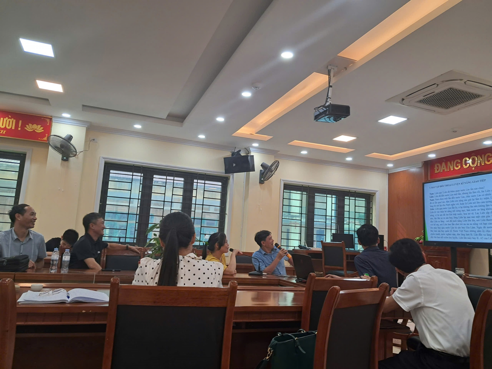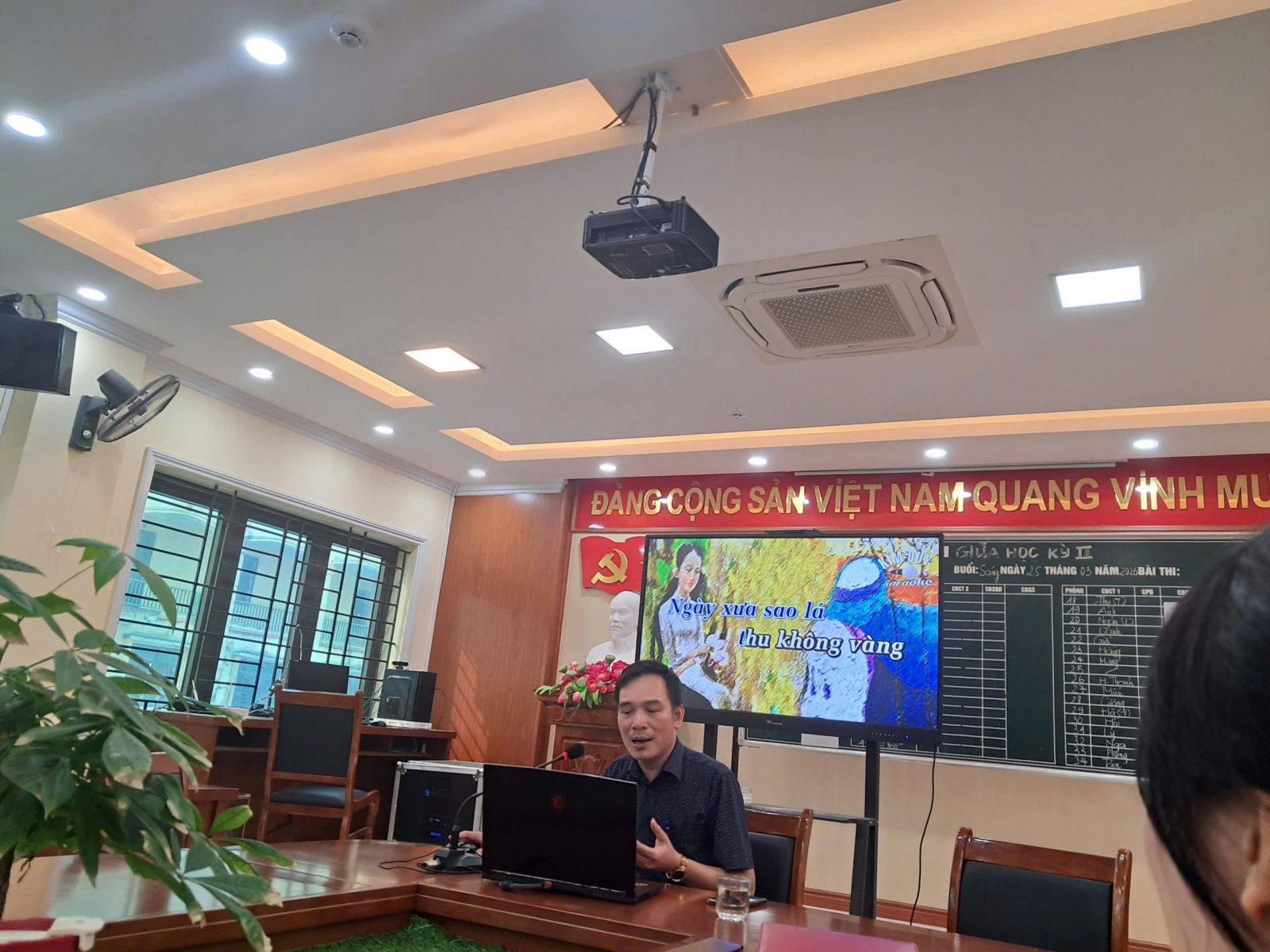 Đồng chí Nguyễn Văn Song – Phó hiệu trưởng chủ trì hội nghị và minh họa hát chuẩn phụ âm L-N qua bài hát “Nắng thủy tinh”(Nhạc sĩ: Trịnh Công Sơn)