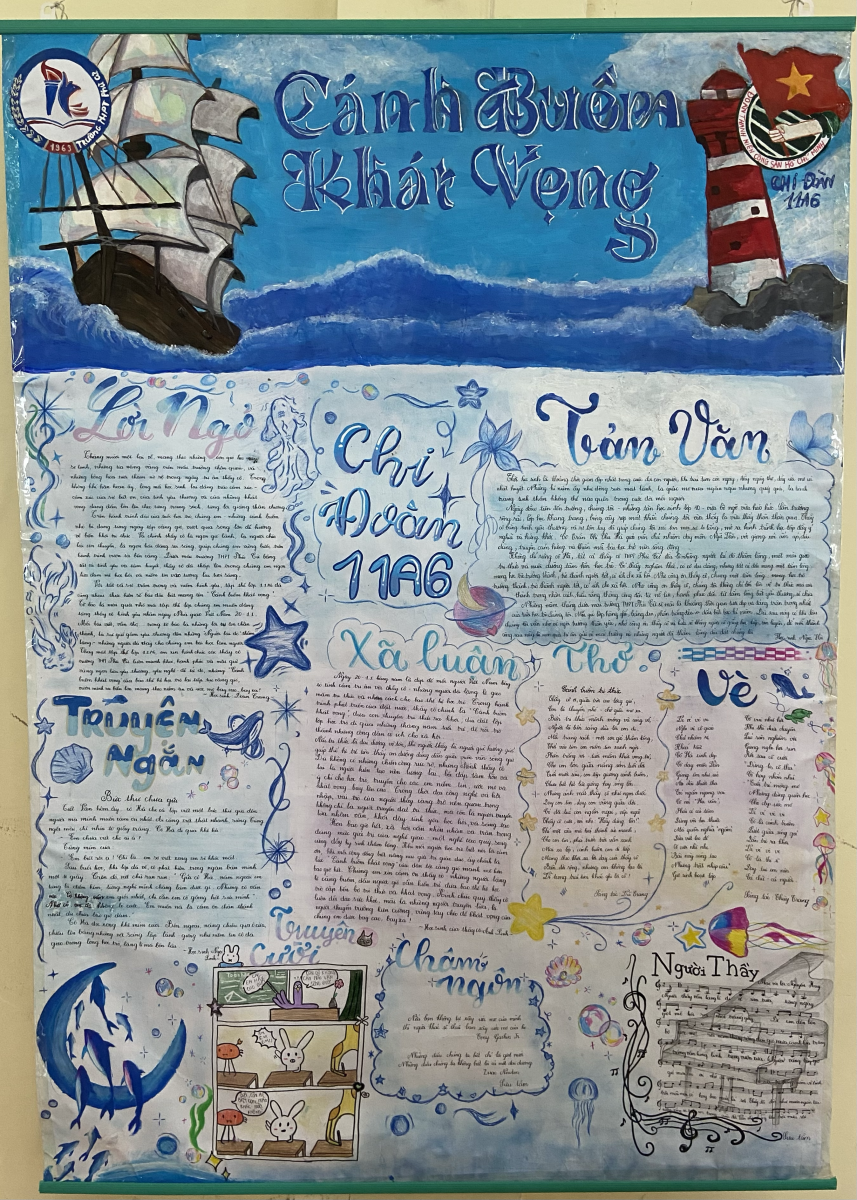 Việc làm báo tường đối với chúng em không chỉ đơn thuần là một hoạt động thi đua của nhà trường mỗi dịp 20–11, mà còn là hành trình để mỗi học sinh nhìn lại chính mình, để biết trân trọng hơn những giá trị của việc học và công lao của thầy cô. Từng trang báo là nơi chúng em học cách làm việc nhóm, biết lắng nghe, chia sẻ, thống nhất ý tưởng và đồng lòng vì một mục tiêu chung. Đó cũng là dịp để mỗi bạn bộc lộ năng khiếu của mình: bạn giỏi viết thì sáng tác, bạn khéo tay thì vẽ, bạn tỉ mỉ thì trang trí, bạn năng động thì đứng ra sắp xếp công việc…Nhóm làm báo tường của chúng em đã được tạo lập khi Đoàn trường triển khai kế hoạch viết báo. Bạn Đoan Trang- nhóm trưởng đã phân công bạn thì đi mua giấy, mua màu và các vật dụng cần thiết; bạn thì viết bài; bạn thiết kế phần vẽ… Ngay khi chủ đề báo được thống nhất, mọi thành viên trong nhóm báo tường đều háo hức bắt tay vào công việc. Nhóm nội dung đã dành nhiều ngày miệt mài bên những trang giấy, để rồi từng dòng chữ dần hiện hình thành Lời ngỏ chân thành sâu lắng, trang Tản văn chất chứa yêu thương, bài Xã luận đầy suy ngẫm về nghề giáo, cùng những vần thơ đầy cảm xúc về Cánh buồm tri thức và bài Vè vui tươi về cô chủ nhiệm do chính tay các bạn trong lớp chúng em sáng tác. Bố cục tờ báo được chúng em xây dựng thành 9 mục rõ ràng: Lời ngỏ, Tản văn, Xã luận, Thơ, Truyện ngắn, Vè, Châm ngôn, Truyện cười, Bài hát/nhạc. Mỗi mục là một “ngăn nhỏ” chứa đựng những tâm tư, tình cảm và lời tri ân gửi tới thầy cô – người lái đò thầm lặng đã dìu dắt, truyền cảm hứng và nâng đỡ chúng em trên hành trình trưởng thành. Từng câu, từng chữ không chỉ là chữ viết, mà là tấm lòng tri ân chân thành của tập thể lớp 11A6 dành cho những người đã thắp sáng ước mơ và nâng đỡ bước chân chúng em trên hành trình trưởng thành. Nhóm mỹ thuật lại thổi hồn vào tờ báo bằng màu sắc và hình ảnh. Trên nền giấy trắng, hình ảnh cánh buồm được vẽ lên – biểu tượng của ước mơ, của chặng đường học tập mà thầy cô chính là người truyền gió, là ngọn hải đăng luôn soi đường, chỉ lối giúp cánh buồm ước mơ bay cao, bay xa.