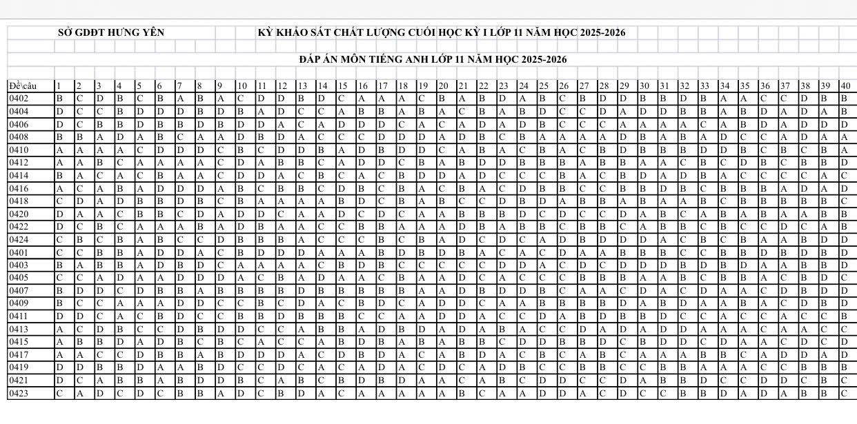 ĐÁP ÁN THI KHẢO SÁT MÔN TIẾNG ANH VÀ HƯỚNG DẪN CHẤM MÔN NGỮ VĂN LỚP 11 NĂM HỌC 2025 - 2026(10/01/2026)