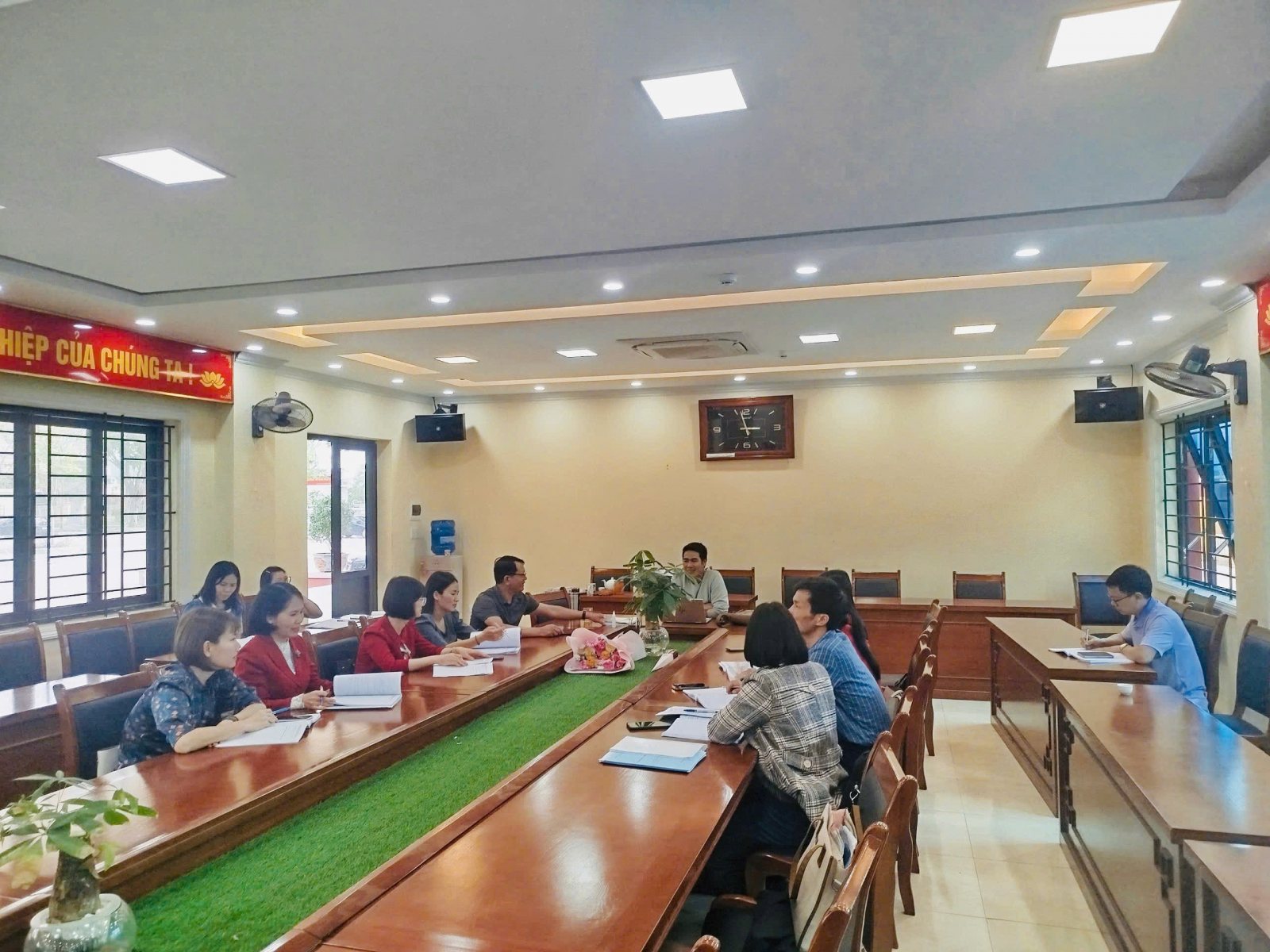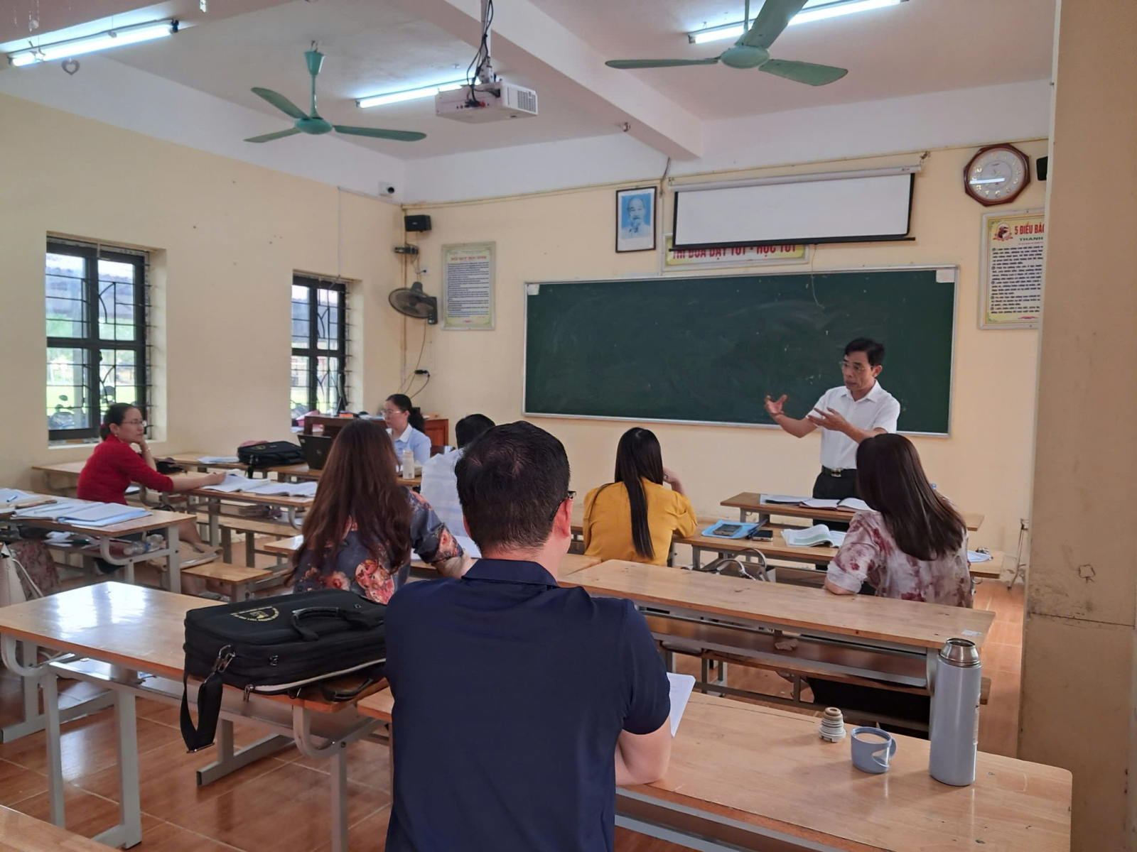 Đ/c Dương Văn Long - Bí thư chi bộ, Hiệu trưởng nhà trường dự họp rút kinh nghiệm sau giờ dạy cùng tổ Văn - GDTC