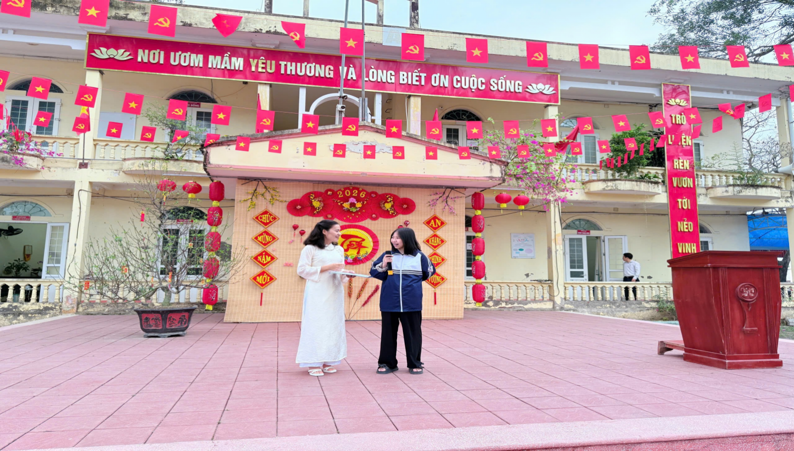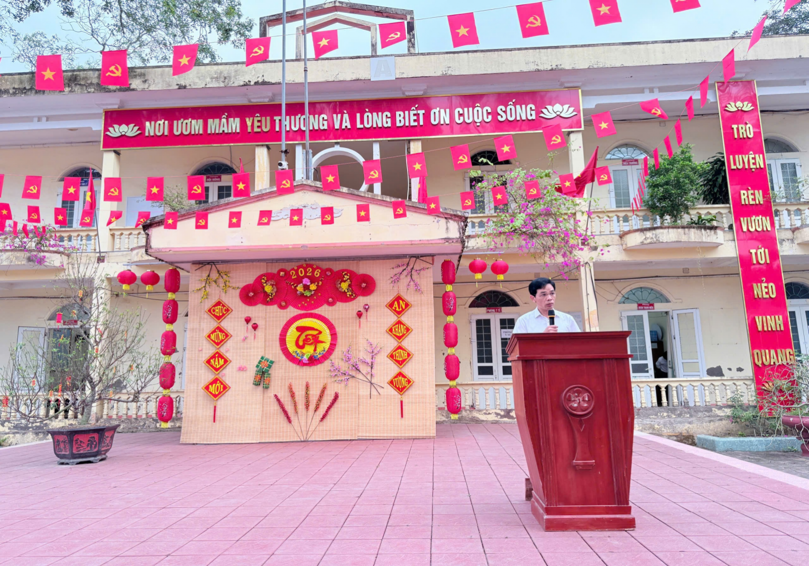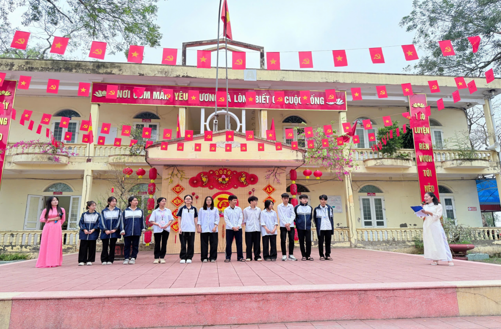 Chương trình được mở đầu với nghi thức chào cờ trang nghiêm và đầy cảm xúc. Dưới lá cờ đỏ sao vàng tung bay trong nắng sớm, toàn thể cán bộ, giáo viên, và học sinh cùng cất cao bài hát Quốc ca, thể hiện niềm tự hào và tinh thần đoàn kết dân tộc. Trong bài phát biểu, thầy Dương Văn Long - Bí thư chi bộ, Hiệu trưởng Nhà trường đã gửi lời chúc mừng ý nghĩa tới toàn thể nữ CBGVNV và các nữ sinh nhân ngày Quốc tế Phụ nữ 8/3 đồng thời phát động phong trào “Thi đua lập thành tích chào mừng ngày Quốc tế Phụ nữ 8/3 và ngày thành lập Đoàn 26/3". Sự xuất hiện và những lời phát biểu tâm huyết, những lời chúc mừng chân thành của thầy đã tạo thêm động lực, lan tỏa tinh thần thi đua sôi nổi, góp phần làm nên thành công tốt đẹp cho buổi giao lưu.