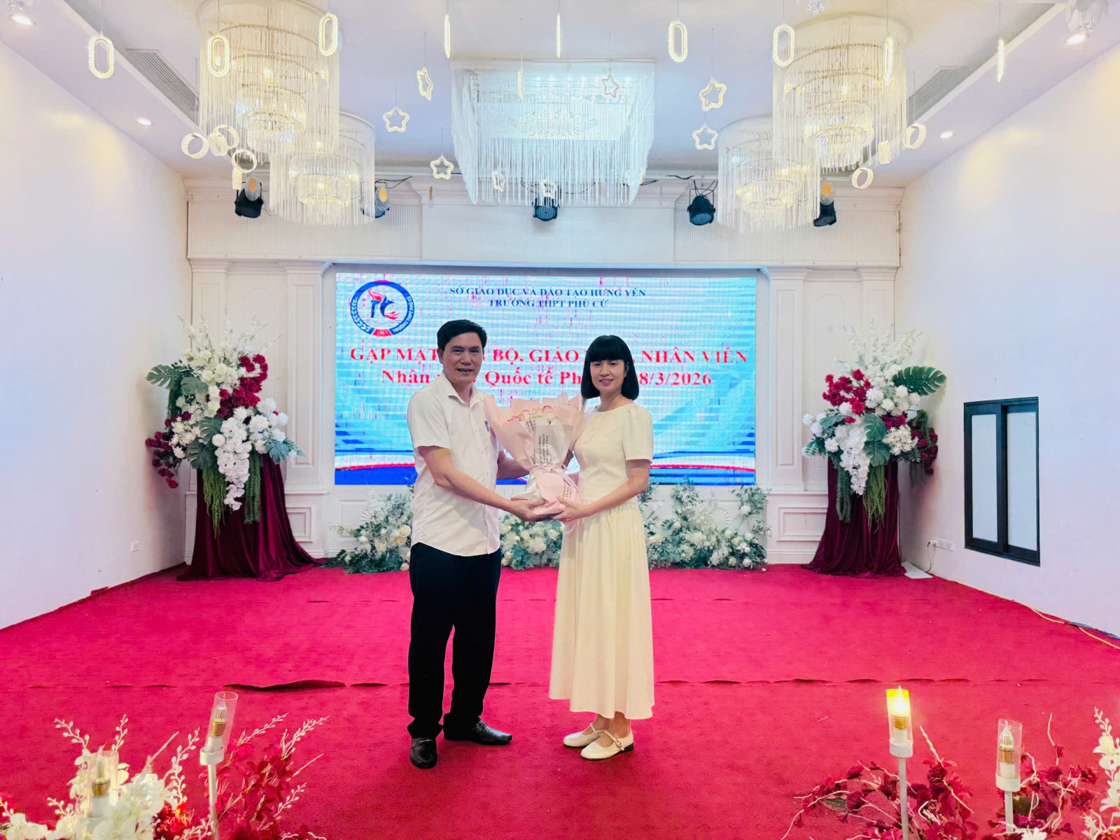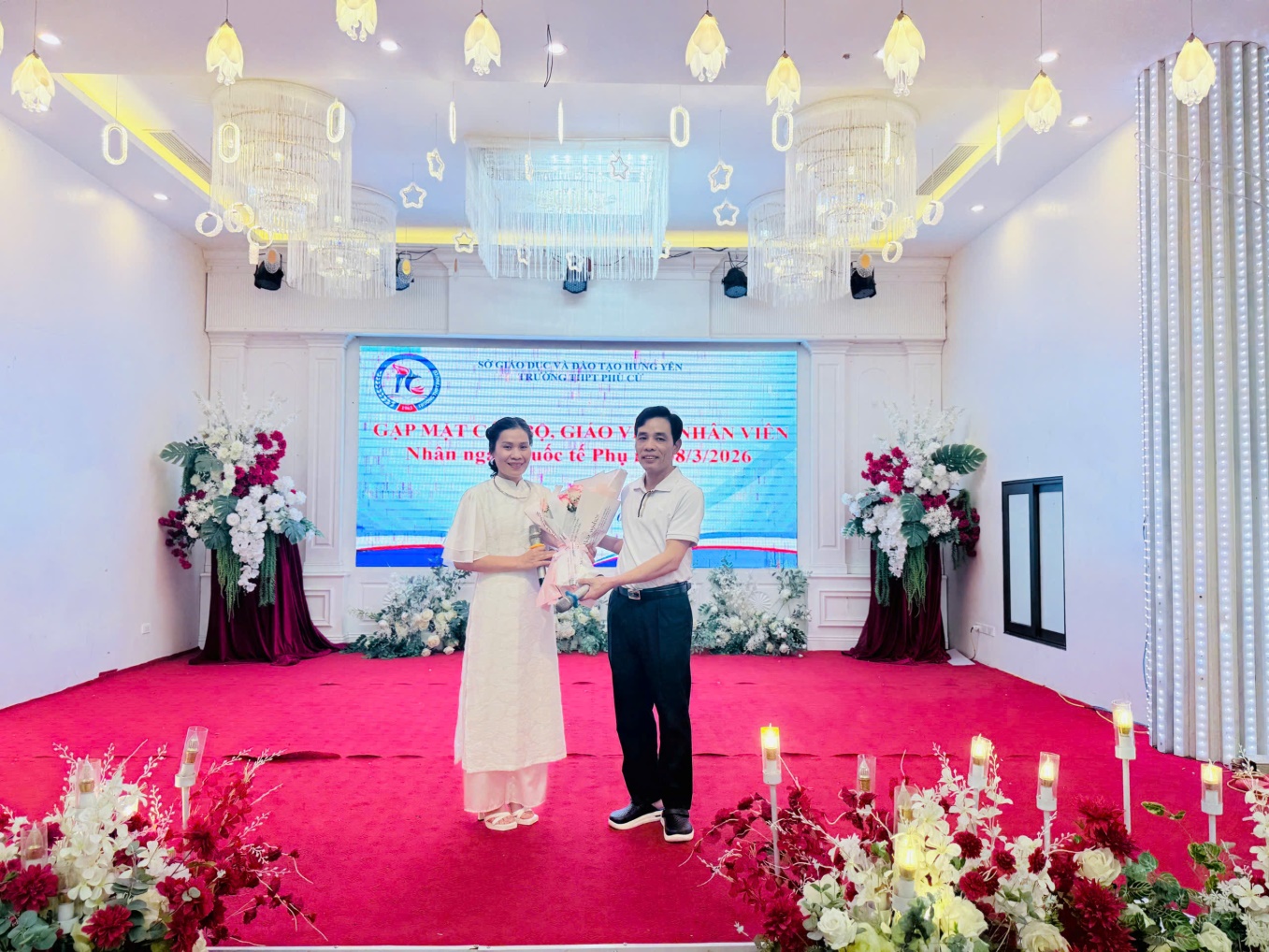 Tuy nhiên, điểm nhấn sâu sắc nhất của hành trình chính là hoạt động kỷ niệm chào mừng ngày Quốc tế Phụ nữ 8/3 - ngày tôn vinh những người Phụ nữ đã và đang lặng thầm cống hiến cho gia đình và xã hội. Trong không khí ấm áp của đêm Gala tối ngày 12 tháng Giêng năm Bính Ngọ 2026, thầy Dương Văn Long - Bí thư Chi bộ, Hiệu trưởng Nhà trường đại diện Lãnh đạo Nhà trường đã tặng hoa và gửi lời tri ân sâu sắc tới toàn thể nữ CBGVNV trường THPT Phù Cừ. Trong bài phát biểu đầy cảm xúc, thầy nhấn mạnh vai trò, vị trí và những đóng góp to lớn của nữ cán bộ, giáo viên, nhân viên trong sự phát triển bền vững của Nhà trường; đồng thời chính thức phát động “Tuần lễ Áo dài” như một cách tôn vinh vẻ đẹp truyền thống, duyên dáng của người phụ nữ Việt Nam trong môi trường sư phạm. Bên cạnh đó các đồng chí nam CBGVNV đã dành những lời chúc tốt đẹp, những bó hoa tươi thắm gửi tới nữ cán bộ, giáo viên, nhân viên Nhà trường - những “bông hoa” rực rỡ làm nên vẻ đẹp dịu dàng mà bền bỉ của mái trường THPT Phù Cừ. Tiếng nhạc rộn ràng, những tiết mục văn nghệ đặc sắc, những tràng pháo tay giòn giã và cả những nụ cười rạng rỡ đã làm nên một đêm Gala đong đầy cảm xúc. Trong khoảnh khắc tuyệt vời đó, mọi khoảng cách bị xóa nhòa chỉ còn lại sự sẻ chia, gắn bó và niềm tự hào khi được là một phần của đại gia đình THPT Phù Cừ.