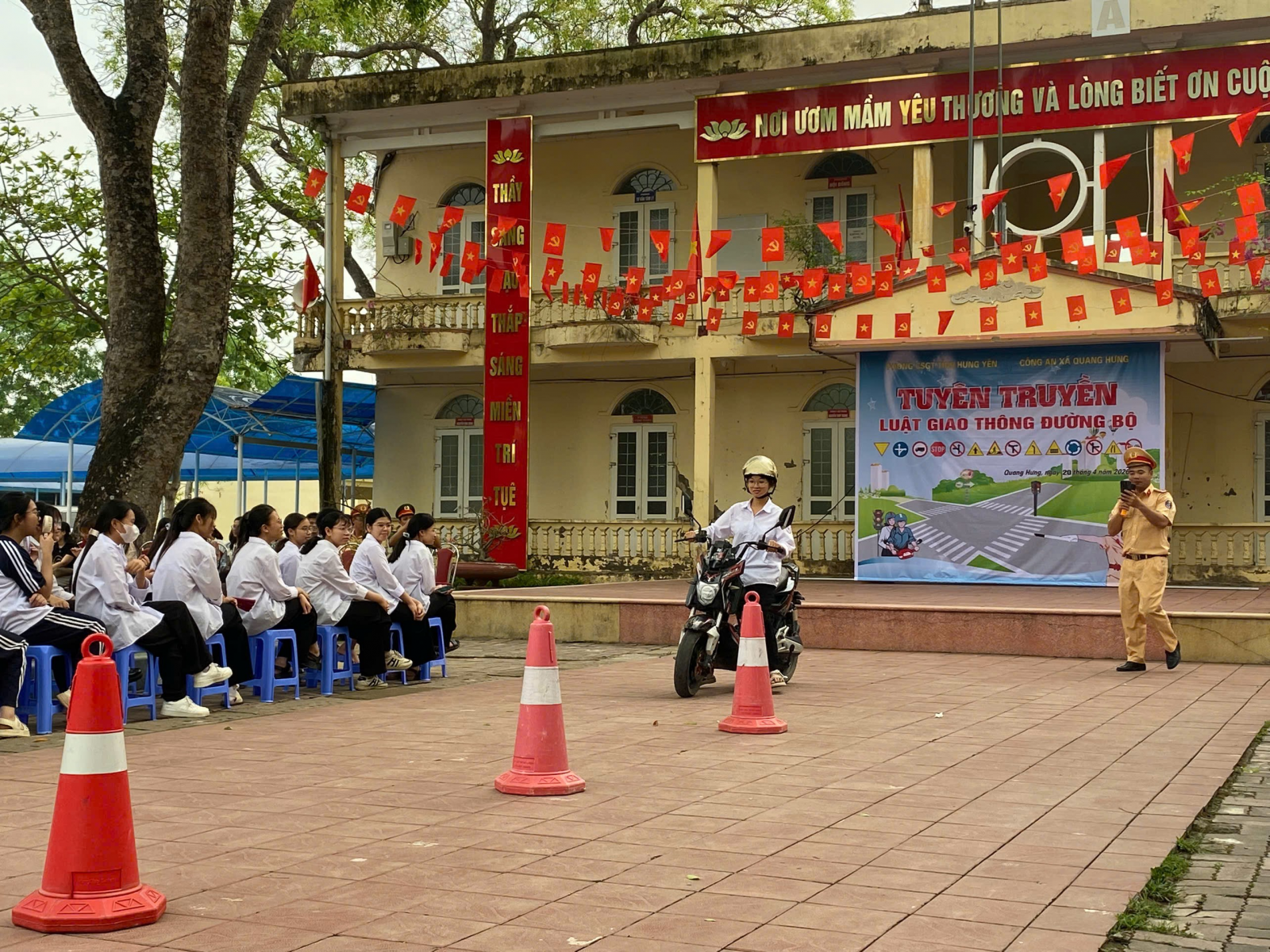 Tiếp nối chương trình, Đại úy Đỗ Văn Dồng - Tổ trưởng Phòng Cảnh sát giao thông tỉnh Hưng Yên đã mang đến phần trao đổi vừa giàu thông tin, vừa giàu tính cảnh tỉnh. Từ những khái niệm nền tảng như đường bộ, Luật an toàn giao thông đường bộ, đến các loại phương tiện phổ biến như xe mô tô, xe gắn máy, xe điện…, Đại úy đã giúp học sinh chúng em tiếp cận kiến thức một cách dễ hiểu, từ đó nâng cao nhận thức và ý thức trách nhiệm khi tham gia giao thông. Đặc biệt, qua việc phân tích thực trạng tai nạn giao thông trong 10 tháng đầu năm 2025 với con số đáng báo động 15.251 vụ, làm 8.515 người thiệt mạng và 10.204 người bị thương, Đại úy đã cảnh báo học sinh về ý thức tham gia giao thông hiện nay. Những nguyên nhân chủ yếu được chỉ ra như: đi sai làn đường, thiếu quan sát, không làm chủ tốc độ, không giữ khoảng cách an toàn, chuyển hướng tùy tiện…, trong đó, lứa tuổi học sinh, sinh viên chiếm tới 22% số vụ tai nạn và đang có xu hướng gia tăng, một thực tế khiến mỗi người không khỏi trăn trở.